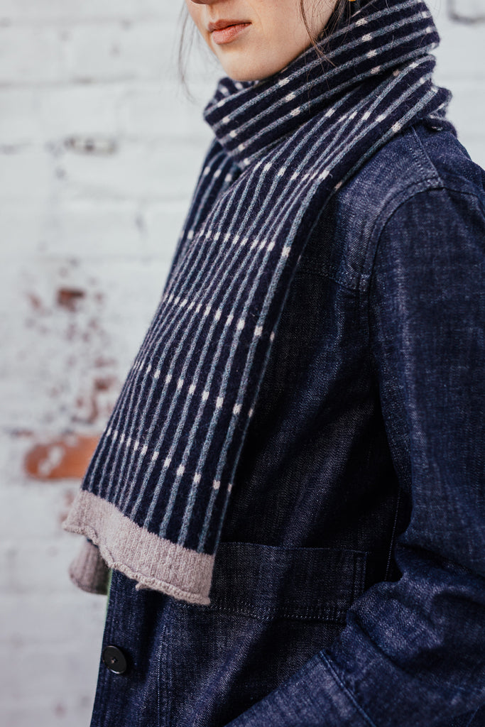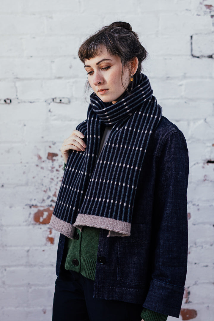 Contemporary unisex scarf knitted in the softest merino lambswool on a vintage Brother knitting machine.