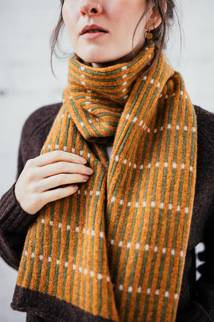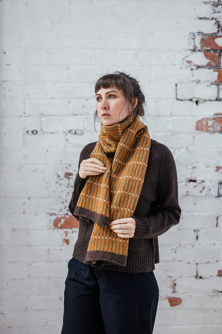 Contemporary unisex scarf knitted in the softest merino lambswool on a vintage Brother knitting machine.